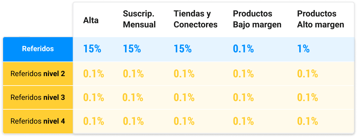 You will receive 15% of the joining fee, the monthly fee, the stores and connectors that your referrals take contracts out on. You will receive 1% from high margin products and 0.1% from low margin products (named brands) purchased by your referrals. In addition, from referrals that your referrals bring to us, you will receive 0.1% of their entire turnover, up to a maximum of 3 levels. For example: if you introduce 10 referrals that have a turnover of €100,000 you will receive approximately €10,000 per year. If you introduce 10 customers that have a turnover of €10,000 per year, you will receive approximately €2,600. If your referrals introduce new referrals, these amounts will be increased by 0.1% of their entire turnover. These examples have been created from real average data sourced from different types of BigBuy customers.
